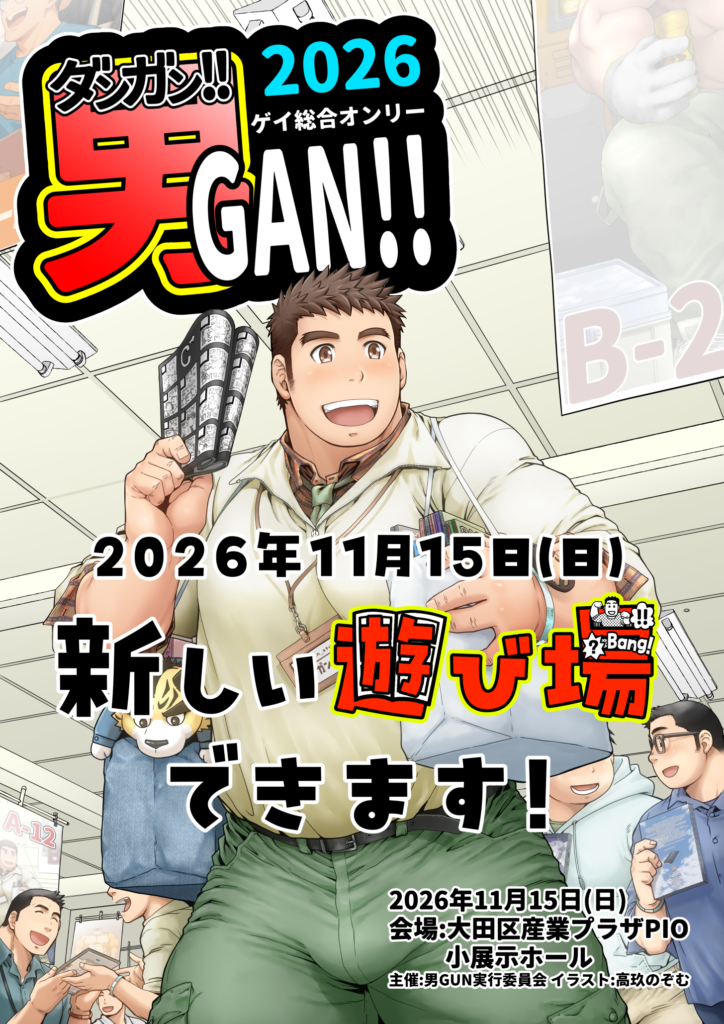 男GAN!!(ダンガン)は、主に男同士の恋愛を含めた関係性をテーマとした創作を扱う成人向け同人誌即売会です、ゲイジャンル全般を扱い、ショタ、デブ、ケモノ、おじいちゃん、BL、人外、などなどイベントが掲げるテーマの内であれば一次、二次創作含めてジャンルは問いません。